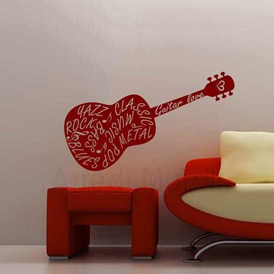 Nell’adesivo murale chitarra noterai varie scritte, sono i generi musicali che rendono questa decorazione da parete ancora più particolare perché sono ad intaglio.