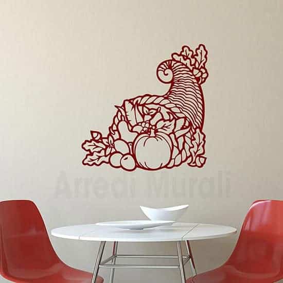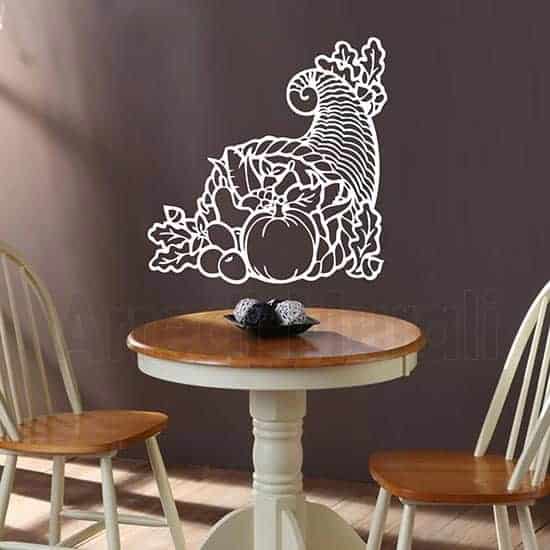 Questo disegno adesivo con cornucopia ricca di cibo puoi anche applicarlo nella tua zona giorno se è predisposta con sala da pranzo.