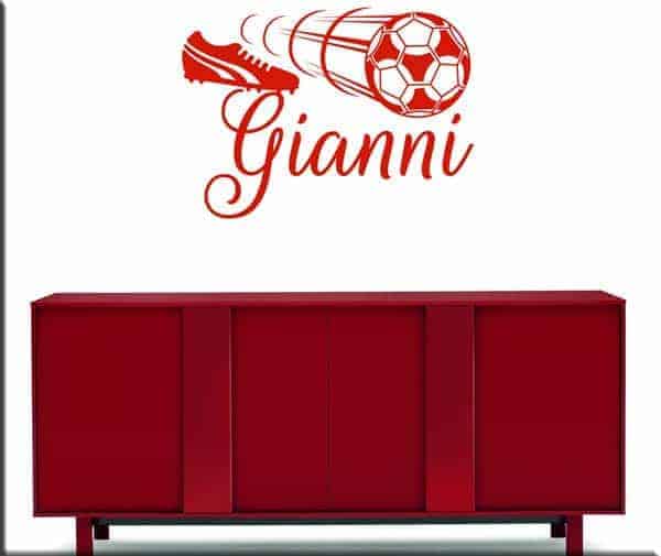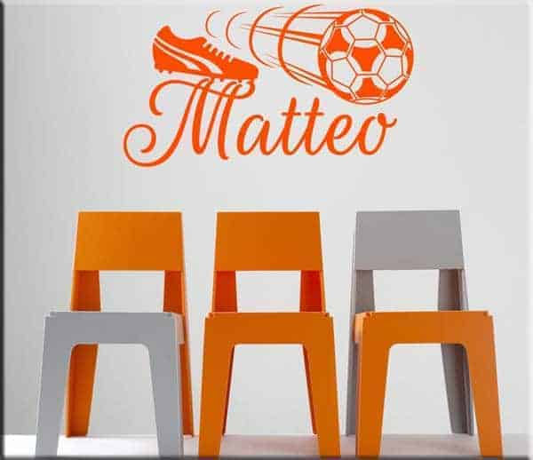 Adesivo da muro nome personalizzato così composto : una scarpetta da calcio, una palla “in movimento” ed il suo nome.