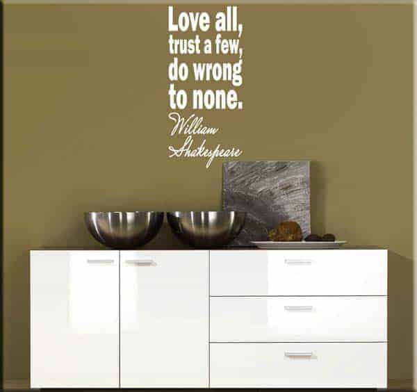 Questo adesivo da parete con frase, che tradotta in italiano significa “Amate tutti, la fiducia a pochi, fare del male a nessuno.” è ideale per chi volesse decorare un’ambiente della casa con stile moderno e con un bel contenuto.