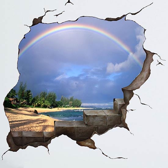 Un adesivo stampato ti permette di avere ad un costo irrisorio il tuo Trompe L’Oeil, in questo caso un buco nel muro che si affaccia sul mare con una bellissima vista.