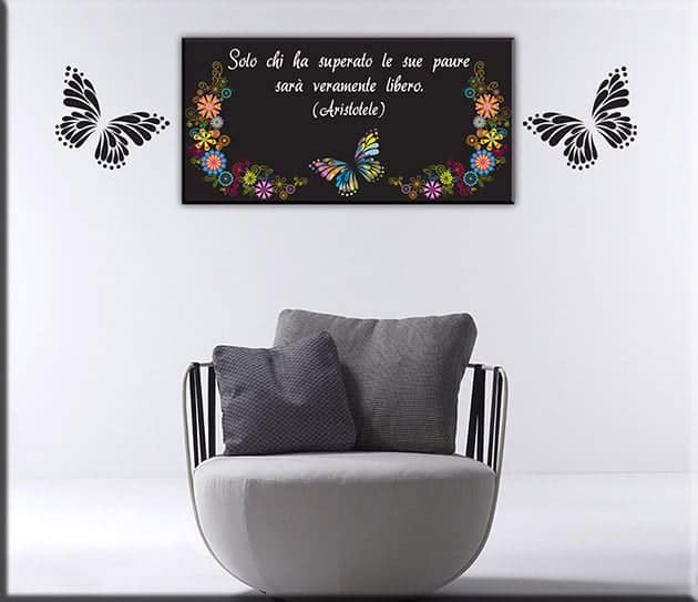 Quadro moderno con stampa su tela con citazione di Aristotele e due adesivi murali farfalle