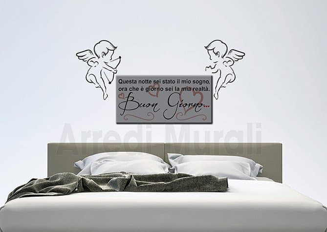 Come puoi ben notare dalle foto, ciò che ti proponiamo è una composizione d’arredo murale che unisce un quadro con frase e 2 angeli stickers.