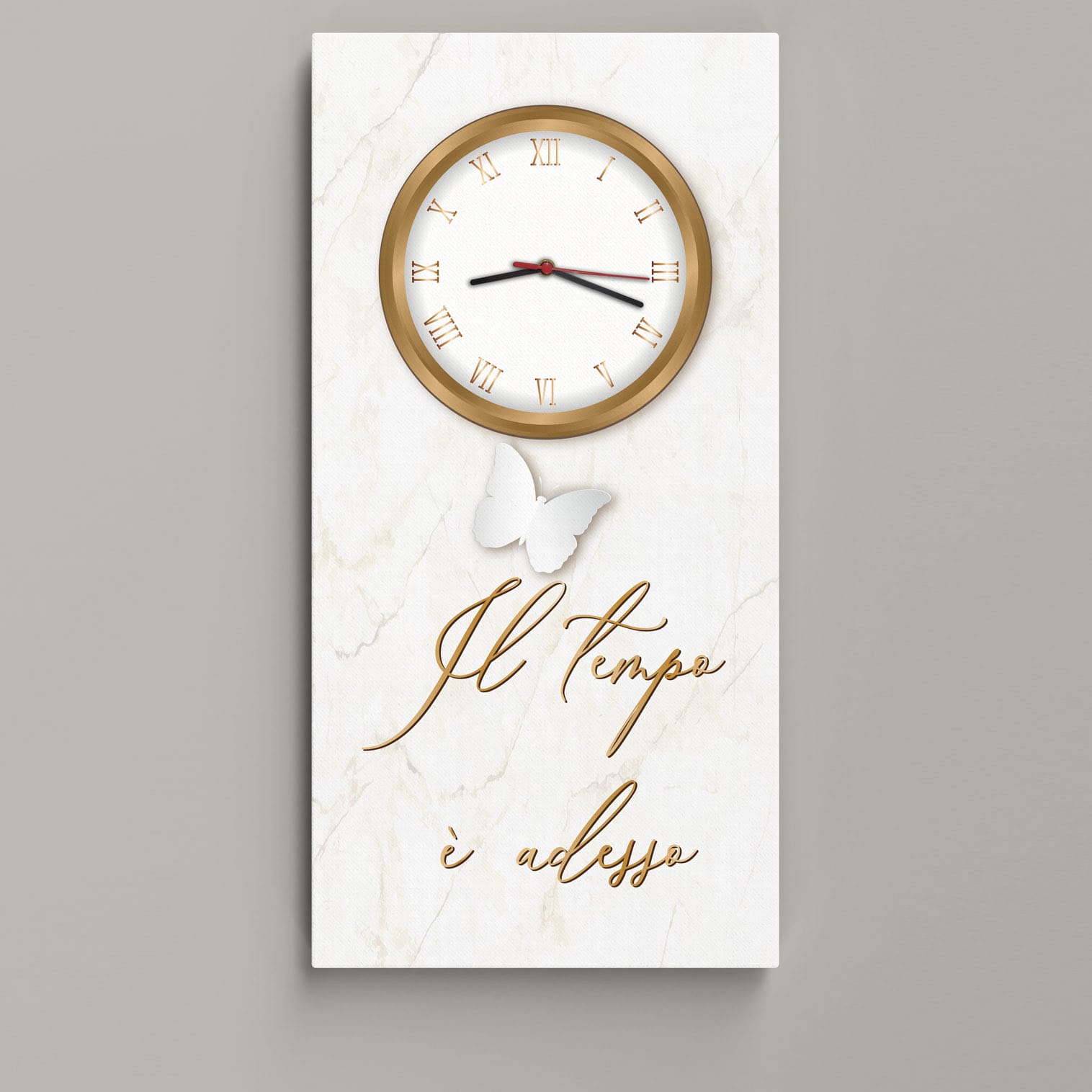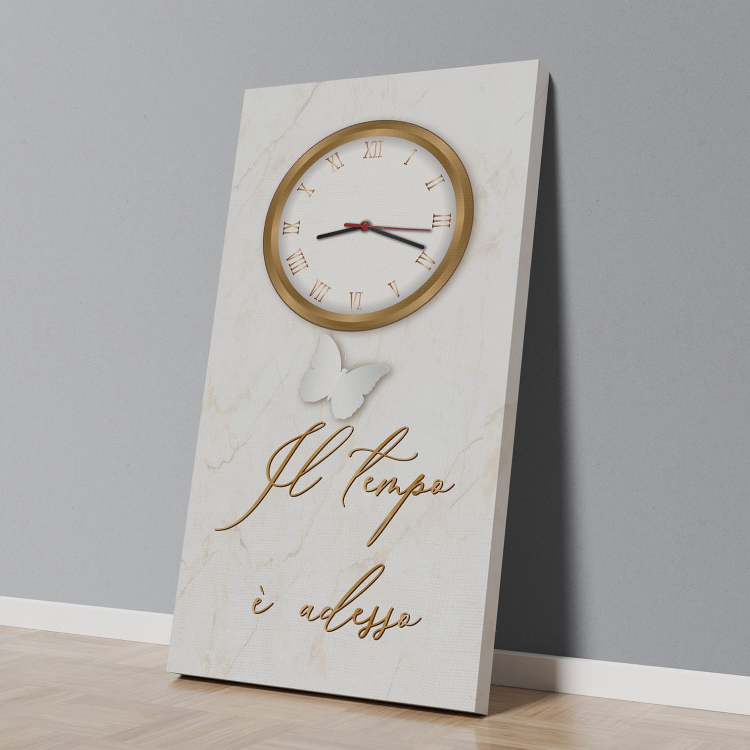Il design combina la funzionalità di un orologio silenzioso con il fascino artistico di una stampa su tela, creando un complemento d’arredo capace di catturare lo sguardo e di trasmettere un messaggio ogni volta che lo si osserva.