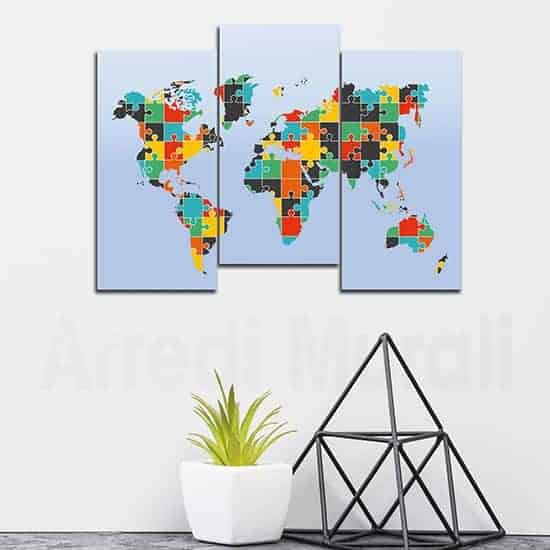 Tris di quadri moderni planisfero realizzati in arte digitale con stampa su tela
