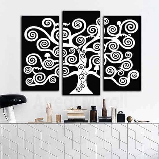 Nei colori bianco e nero questi quadri moderni con tele Albero della Vita sono un complemento d’arredo murale perfetto in un ambiente moderno o minimal.