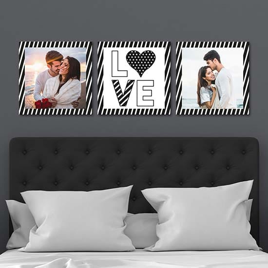 Si tratta di due quadri personalizzati con le foto che ci invierete e un quadro centrale con la scritta love.