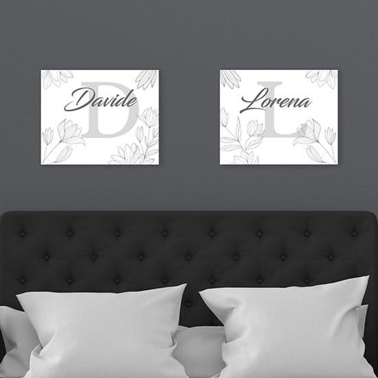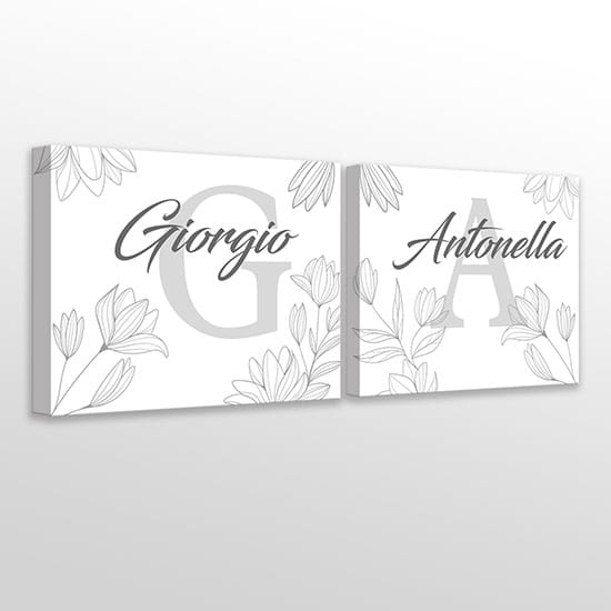 Due quadri su tela personalizzati con i vostri nomi, pronti da appendere per arredare con originalità.