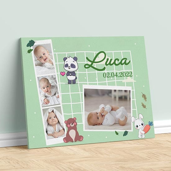 Una esclusiva stampa su tela che verrà personalizzata con il nome e la data che ci indicherai e le 4 foto del bambino o la bambina.
