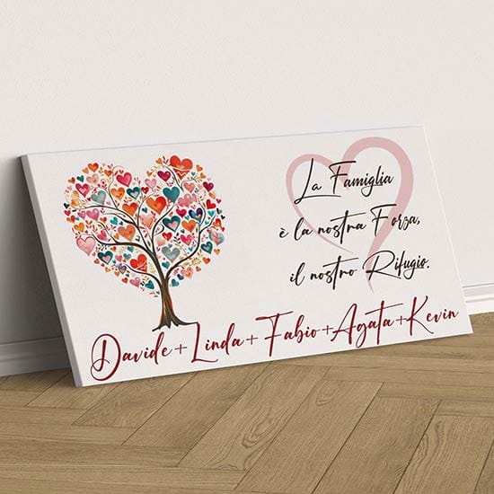 La particolarità di questo tipo di quadro su tela è la possibilità di personalizzarlo con i nomi dei membri della famiglia, rendendolo unico e speciale.