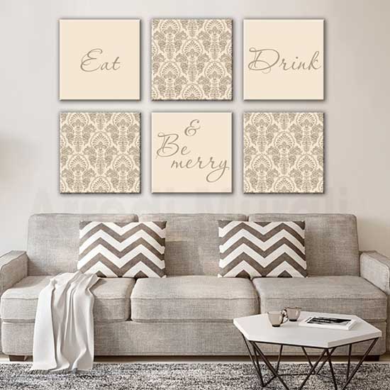 L’intera decorazione murale è composta da sei quadri con stampe su tela eat drink & be merry e la possibilità di scegliere tra due possibili dimensioni:
